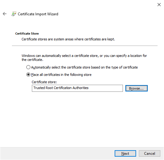 Here select option Place all certificates in the following store, then browse